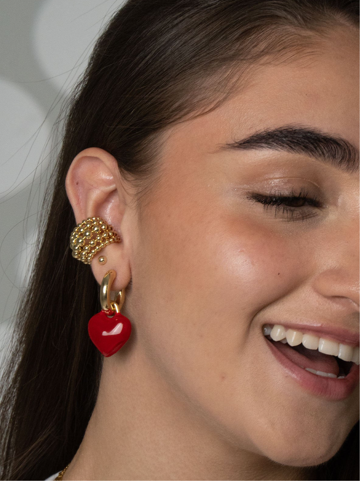 Hoops Amore Mio Carmesí es un grito suave de amor propio. Con su corazón rojo brillante colgando de un aro dorado, esta pieza es perfecta para quienes se expresan con seguridad, dulzura y un toque atrevido. Lo mejor: puedes usarlos con o sin el dije de corazón, según tu mood. Dos estilos, una sola actitud.