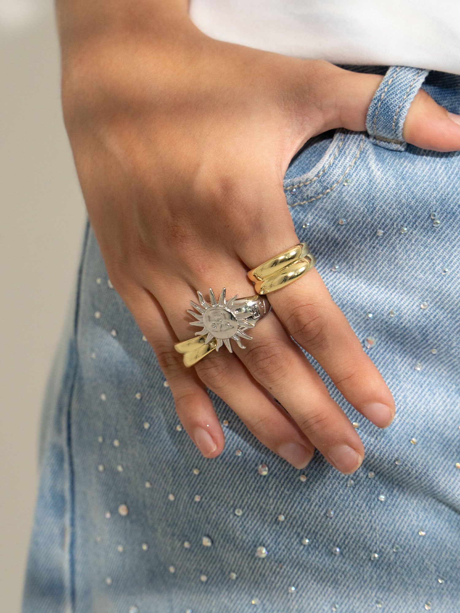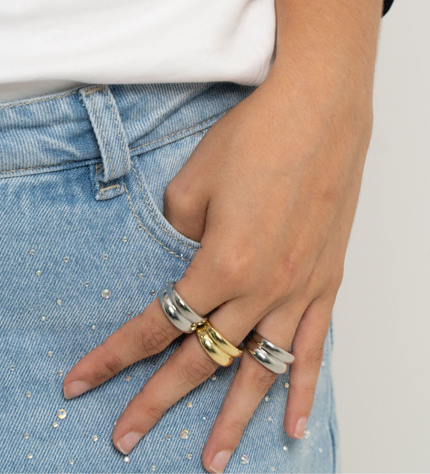 Kioto Ring está hecho para acompañarte con fuerza y sutileza, según lo que elijas reflejar. Disponible en tono dorado o plateado, este anillo de diseño moderno y textura envolvente aporta presencia sin esfuerzo. Su estructura pulida tipo espejo lo convierte en ese básico con carácter que se adapta a ti… y no al revés.